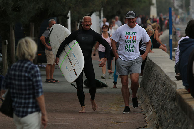 Ander voordeel was dat het hier lekker rustig was in het water. Hossegor en Capbreton lijken in deze periode wel de Spaanse versie van Scheveningen. Tijdens de lunch werd duidelijk dat de QuikPro en RoxyPro vandaag de finales gaan varen. We scheurden terug naar Hossegor en konden nog een parkeerplekje vinden op slechts enkele kilometers lopen van het wedstrijdterrein La Graviere:(
