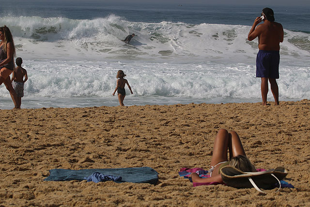 We reden terug naar Hossegor en kozen voor een beproefd concept: uitpeddelen op La Sud / Plage Centrale en peddelen naar La Nord. Daar kwamen mooie sets binnen, maar toch iets lastiger te pakken dan de gemiddelde Hollandse meuk. In dat soort situaties kijk ik vooral naar oude grijze mannen met guns om mijn taktiek op af te stemmen. Mijn eerste golf vond ik best indrukwekkend alleen jammer dat die aan twee kanten cloosde. Ik besloot langs de 10 tot 15 fotografen richting Plage Centrale te lopen om opnieuw uit te peddelen. Een indrukwekkende sessie met niet echt een hoge score qua aantal golven, maar wel van hoge kwaliteit.