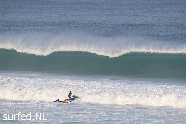 Zondagochtend (mooi weer en zonnig, de temperatuur ging richting 30 graden) doen we zoals gebruikelijk onze surfcheck op Hossegor. De surf zou je stevig kunnen noemen als je uit Nederland komt. Aan mededelingen over de golfhoogte doe ik niet mee, aangezien wij surfers nogal de neiging hebben de golfhoogte ernstig naar boven af te ronden. Wij dachten in ieder geval aan de fijne channels van Messanges waar je met droog haar buiten kan komen. Een goed half uur later stonden we met onze vrienden uit Urk op het duin van Messanges naar de zee te staren. De channels waren verdwenen en alles wat we zagen waren jetski’s en een handvol surfers, waaronder enkele bekenden in de surfwereld. Uitpeddelen (zonder opgevoerd vervoermiddel) was niet echt een optie.