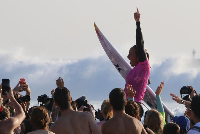 De crowd op het strand was enorm en foto’s maken een uitdaging. Maar we zagen in ieder geval de halve finale van John John tegen Medina en de finale’s van zowel de dames als de heren. Ons was niet helemaal duidelijk waarom er zo’n haast werd gemaakt om de wedstrijden af te ronden. De voorspellingen voor de volgende dagen waren best wel goed …