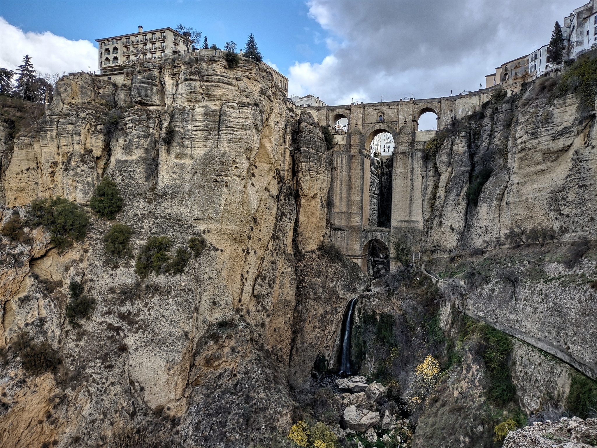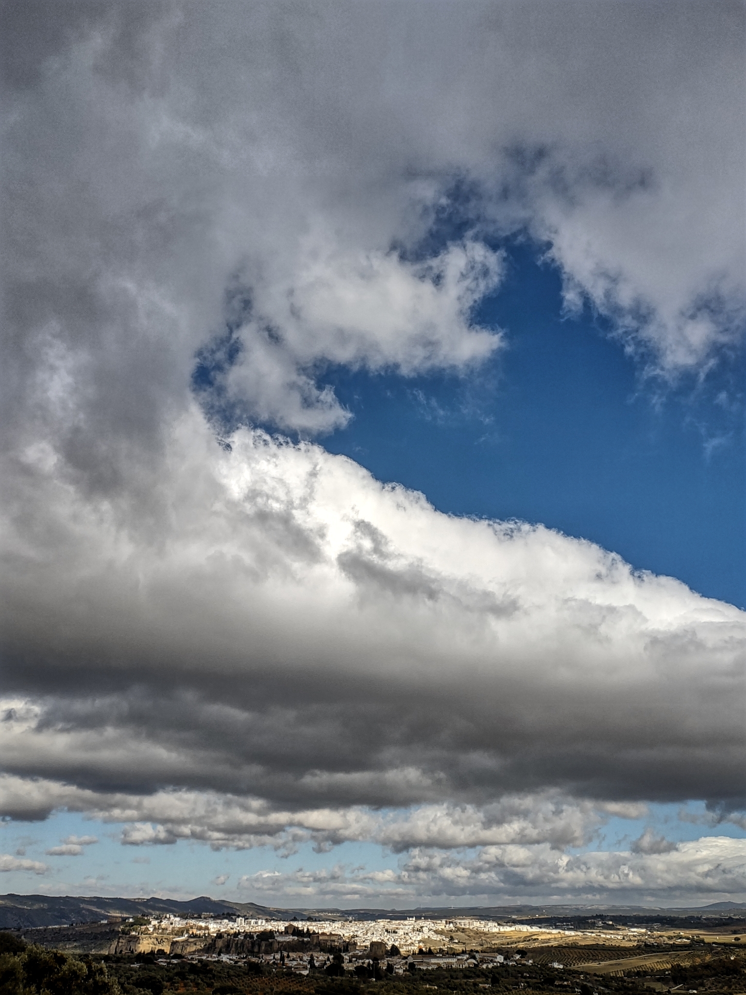 Donderdagochtend genieten we nog een keer van het uitzicht over Granada tijdens het ontbijt. Het is weer strak blauw aan de hemel, alleen is het ochtends nog best fris. We rijden in de loop van de ochtend de stad uit richting Ronda. De weg slingert zich door de bergen en langs eindeloze velden met olijfbomen. Het is allemaal weer prachtig, alleen komen er wel steeds meer wolken aan de horizon.