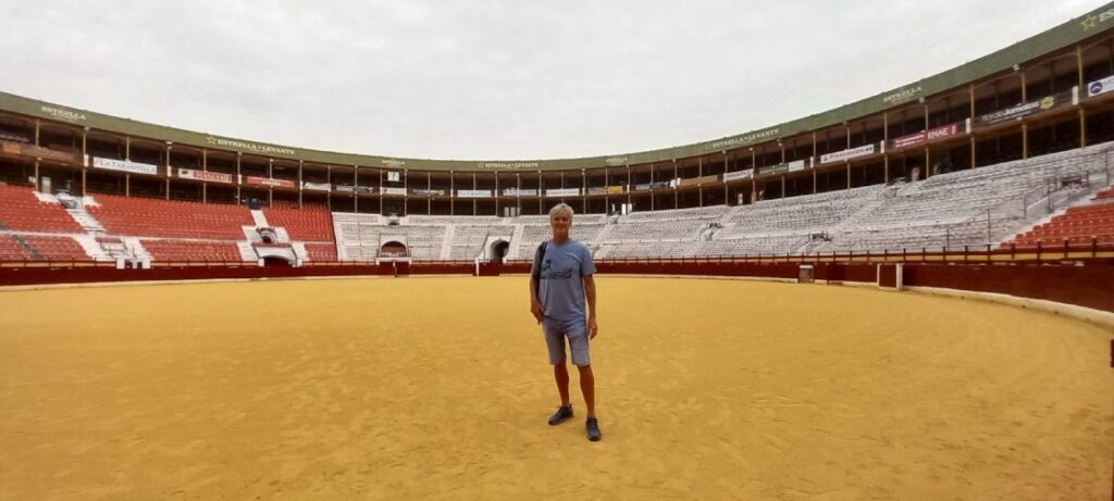 We wandelen naar het stierenvecht arena (plaza de Toros), waar toevallig (?) een deur open staat. We maken selfies in de arena #selfielife We wandelen rond het stadion van Real Murcia. Eten en drinken doen we voor het eerst deze reis binnen. Als we naar buiten gaan, is het alsof je tegen een muur oploopt.